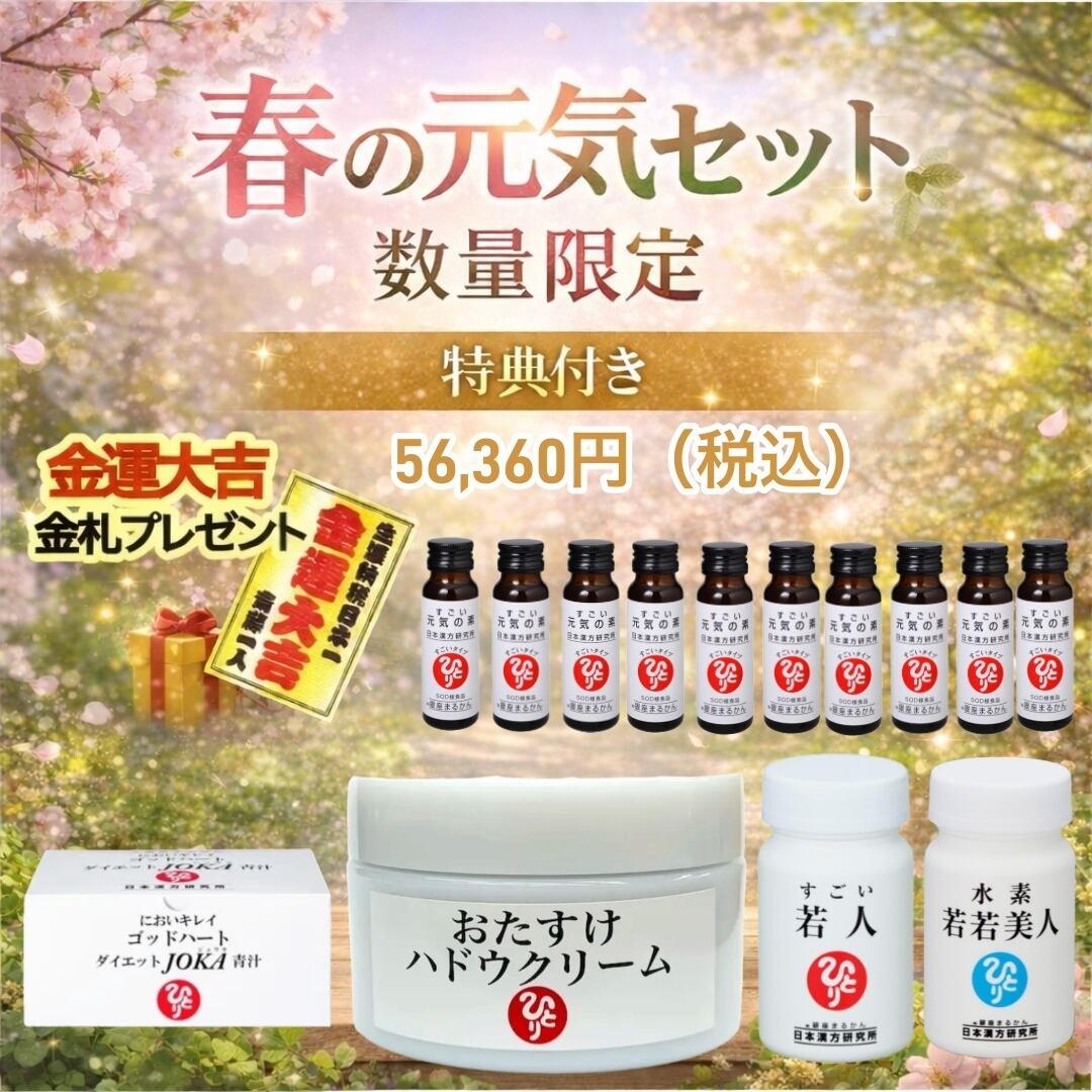【感謝祭】春の元気セット 56,360円(税込み) ひとりさん金札プレゼント おたすけハドウクリーム 水素若若美人 ゴッドハートダイエットJOKA青汁 すごい若人 すごい元気の素10本 限定数量